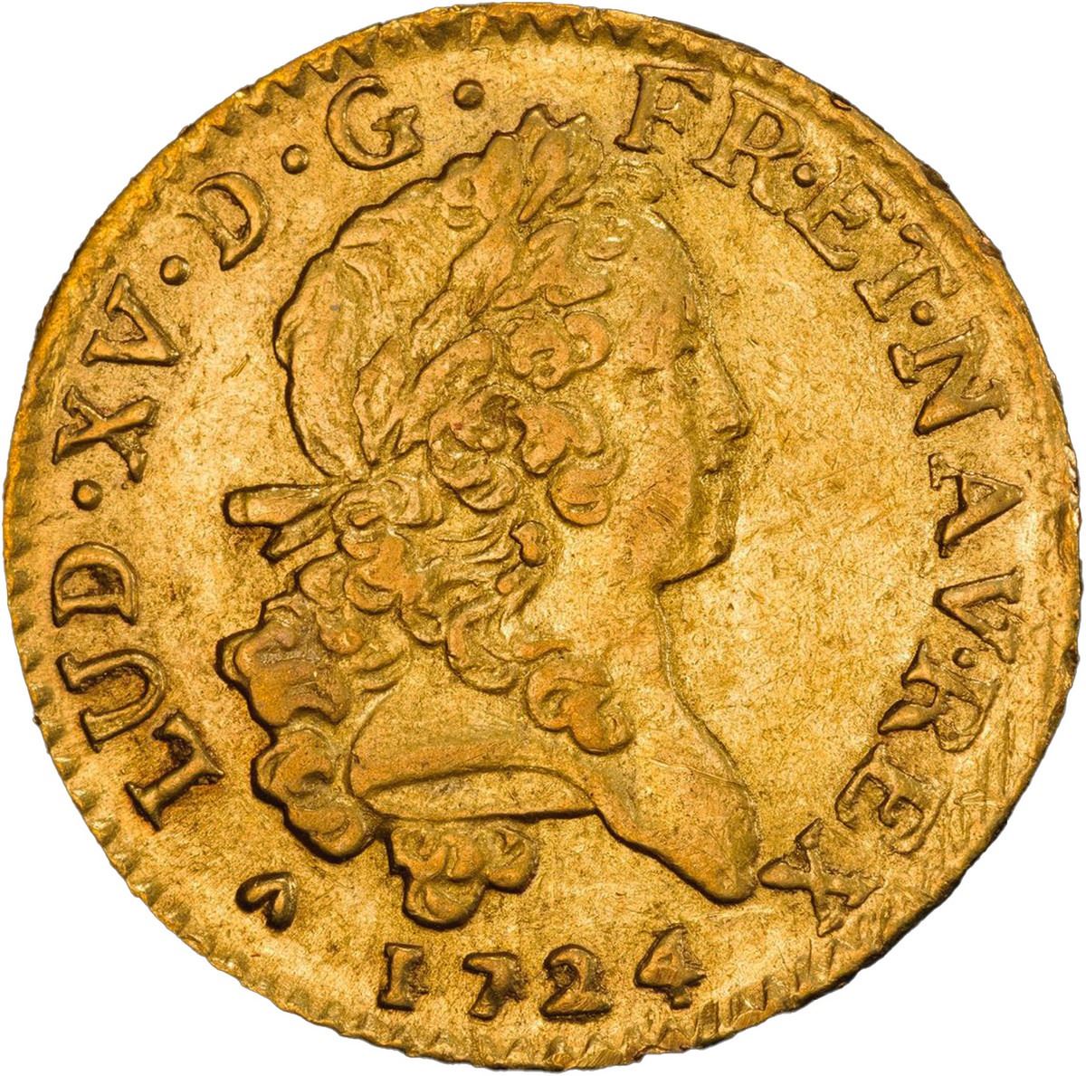 FRANCE, Aix mint, gold louis d'or Mirliton, Louis XV, 1724-&, PCGS AU55. Gad-339; Dupl-1638; KM-470.26; Fr-459. Bold details with nice luster, full but slightly crude rims (as made), same type as from the Chameau shipwreck but not salvaged and a scarce mint (rated R in Gadoury).