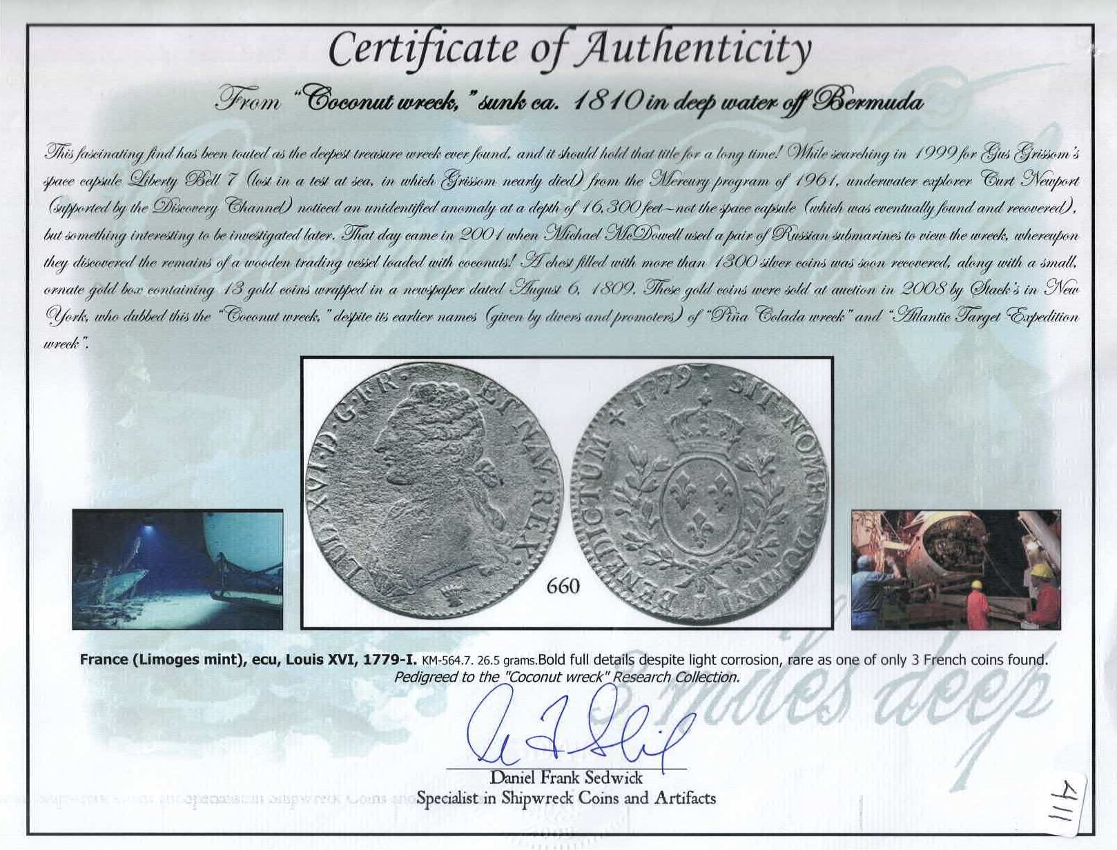 FRANCE, Limoges mint, ecu, Louis XVI, 1779-I, rare, ex-"Coconut wreck" Research Collection. KM-564.7; Gad-356. 26.57 grams. XF with only light surface corrosion, all details clear, choice and unusual coin for this wreck, rated R2 in Gadoury. From the "Coconut wreck" Research Collection (Sedwick Auction 6, with original lot-tag 660), with Sedwick photo-certificate and DVD about the wreck. Recovered from: "Coconut Wreck," sunk ca. 1810 in deep water off Bermuda