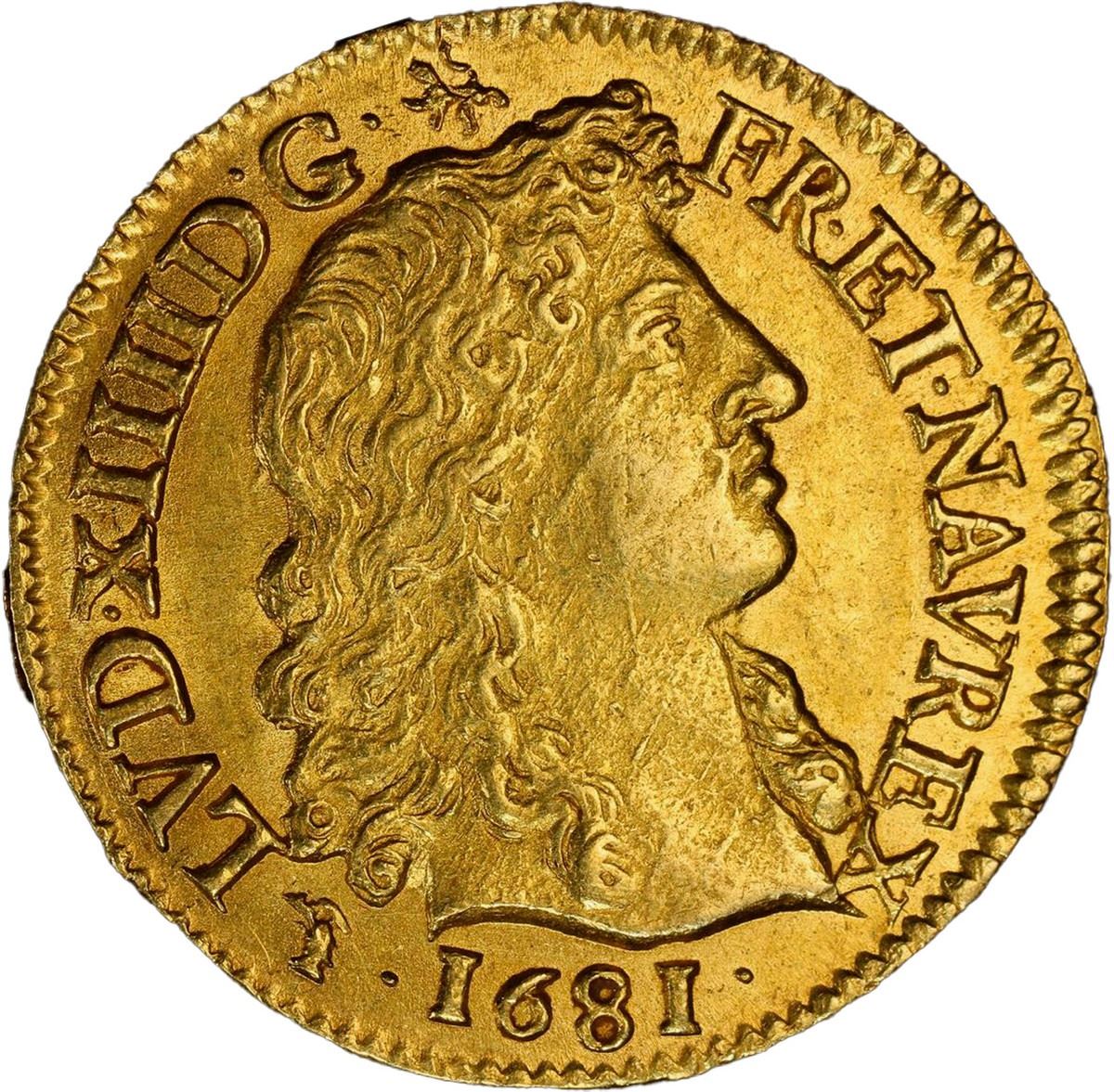 FRANCE, Lyon mint, gold louis d’or à la tête nui, Louis XIV, 1681-D, PCGS MS63, finest know