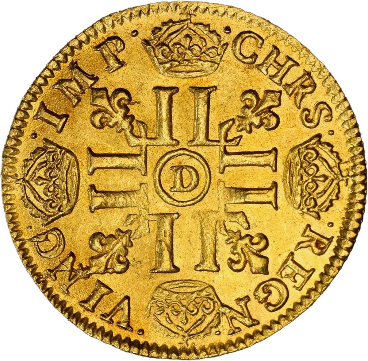 FRANCE, Lyon mint, gold louis d’or à la tête nui, Louis XIV, 1681-D, PCGS MS63, finest known in PCGS census. Gad-247; Dupl-1428; KM-219.3; Fr-423. Bold strike with full rims, nice luster, rich gold color, the finest at PCGS with none at NGC, rated R in Gadoury, a very choice coin for this period, characterized by the "Sun King's" growing rivalry with the English in the New World.