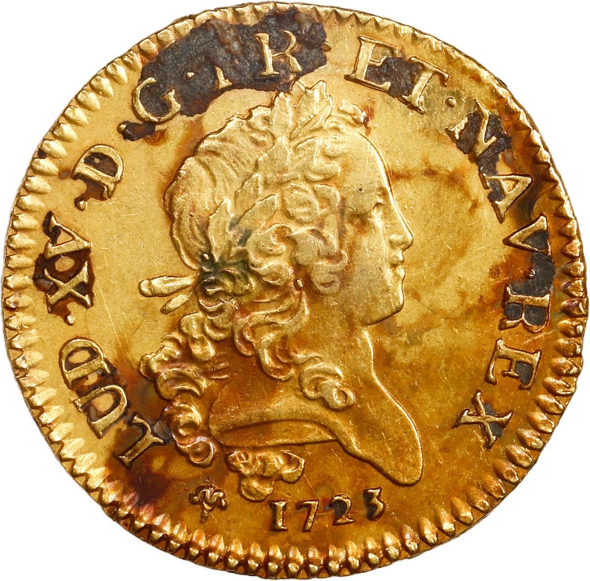 FRANCE, Orleans mint, gold louis d'or Mirliton, Louis XV, 1723-R, encrusted with tiny lead birdshot.