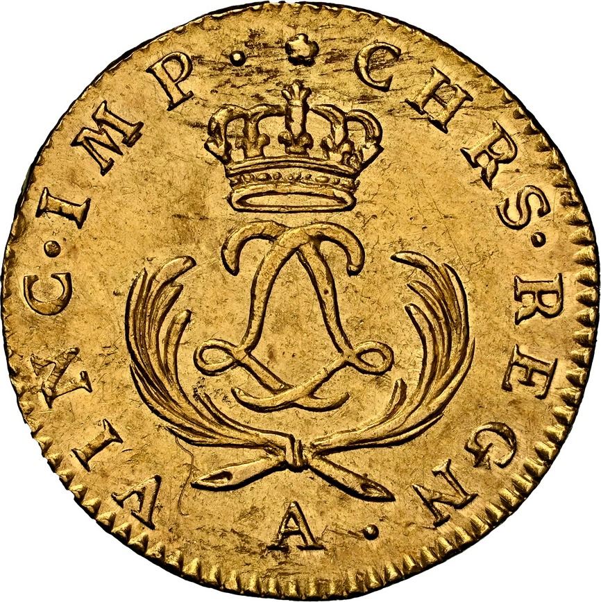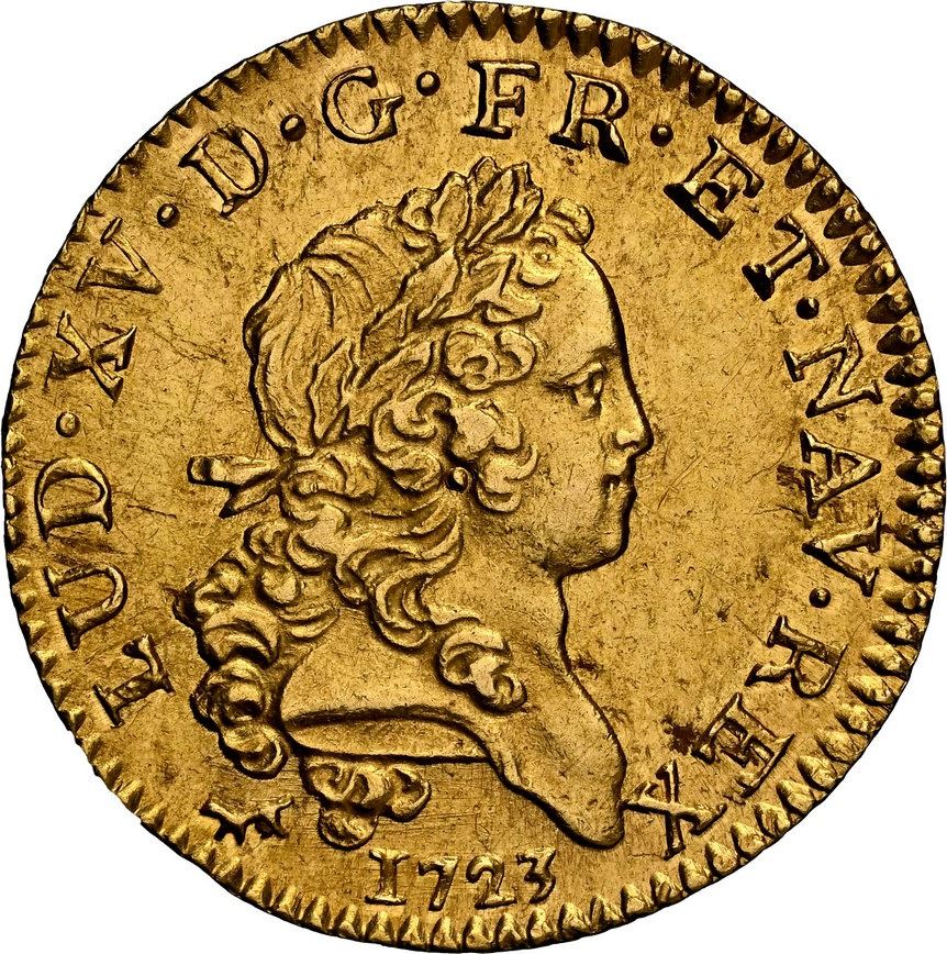 FRANCE, Paris mint, gold louis d'or Mirliton, 1723-A, short palm branches, NGC AU 58 (Shipwreck Blue Label). Gad-338; Dupl-1638A; Fr-459; KM-468.1. Rich gold color, muted luster but no damage and desirable with a numeric grade. Recovered from: Le Chameau, sunk in 1725 off Nova Scotia, Canada