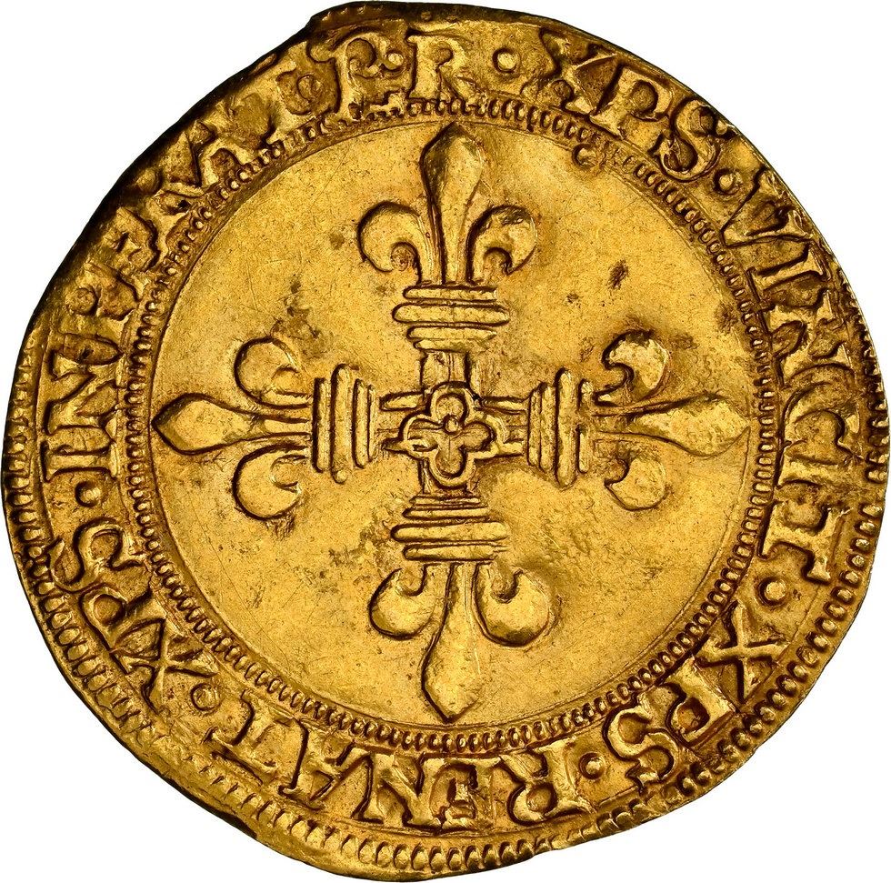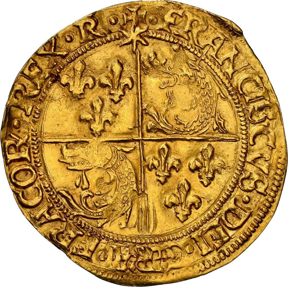 FRANCE, Romans mint, gold ecu d'or du dauphiné, Francis I, NGC AU 58. Fr-354; Gad-321; Dup-782. 3.38 grams. Lustrous and fully detailed including legends, struck slightly off-center. (Note: NGC label erroneously attributes this coin to Charles VIII.).