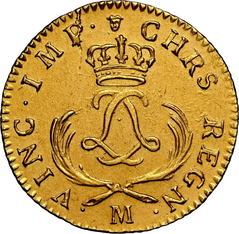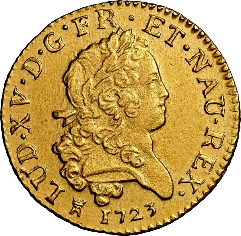 FRANCE, Toulouse mint, gold louis d'or Mirliton, Louis XV, 1723-M, short palm branches, NGC UNC details / saltwater damage (Shipwreck Blue Label). Gad-338; Dupl-1638; Fr-459; KM-468.6. Bold strike, muted luster and matte surfaces, scarce mint (R in Gadoury) that used NAU instead of NAV in obverse legend. Recovered from: Le Chameau, sunk in 1725 off Nova Scotia, Canada