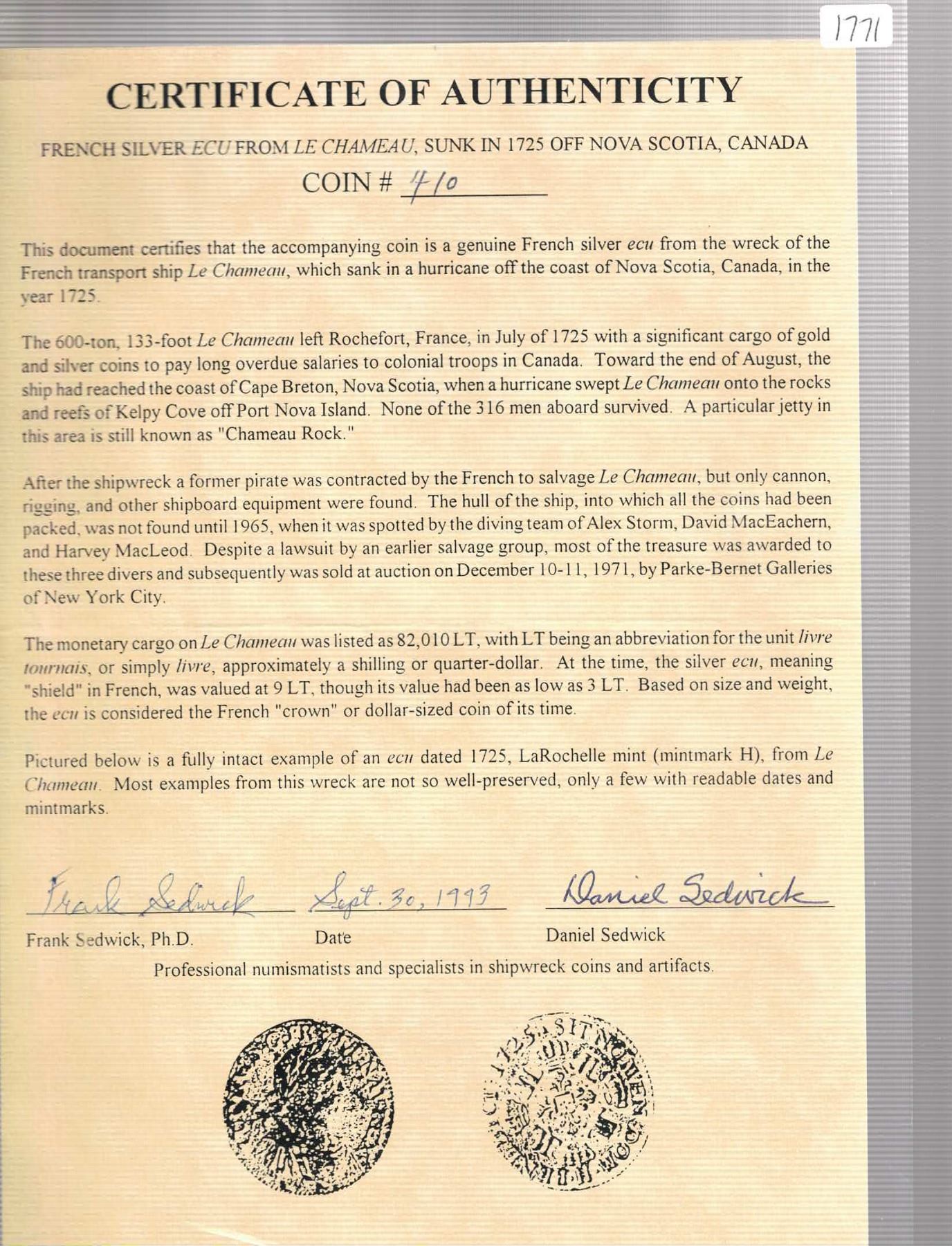 FRANCE, mint uncertain, ecu, Louis XV, date not visible, ex-Sedwick. 17.66 grams. Steely gray-toned piece with corroded surfaces, some bust detail visible, nice provenance. With original (hand-signed) Frank and Daniel Sedwick certificate number 410 from 1993. Recovered from: Le Chameau, sunk in 1725 off Nova Scotia, Canada