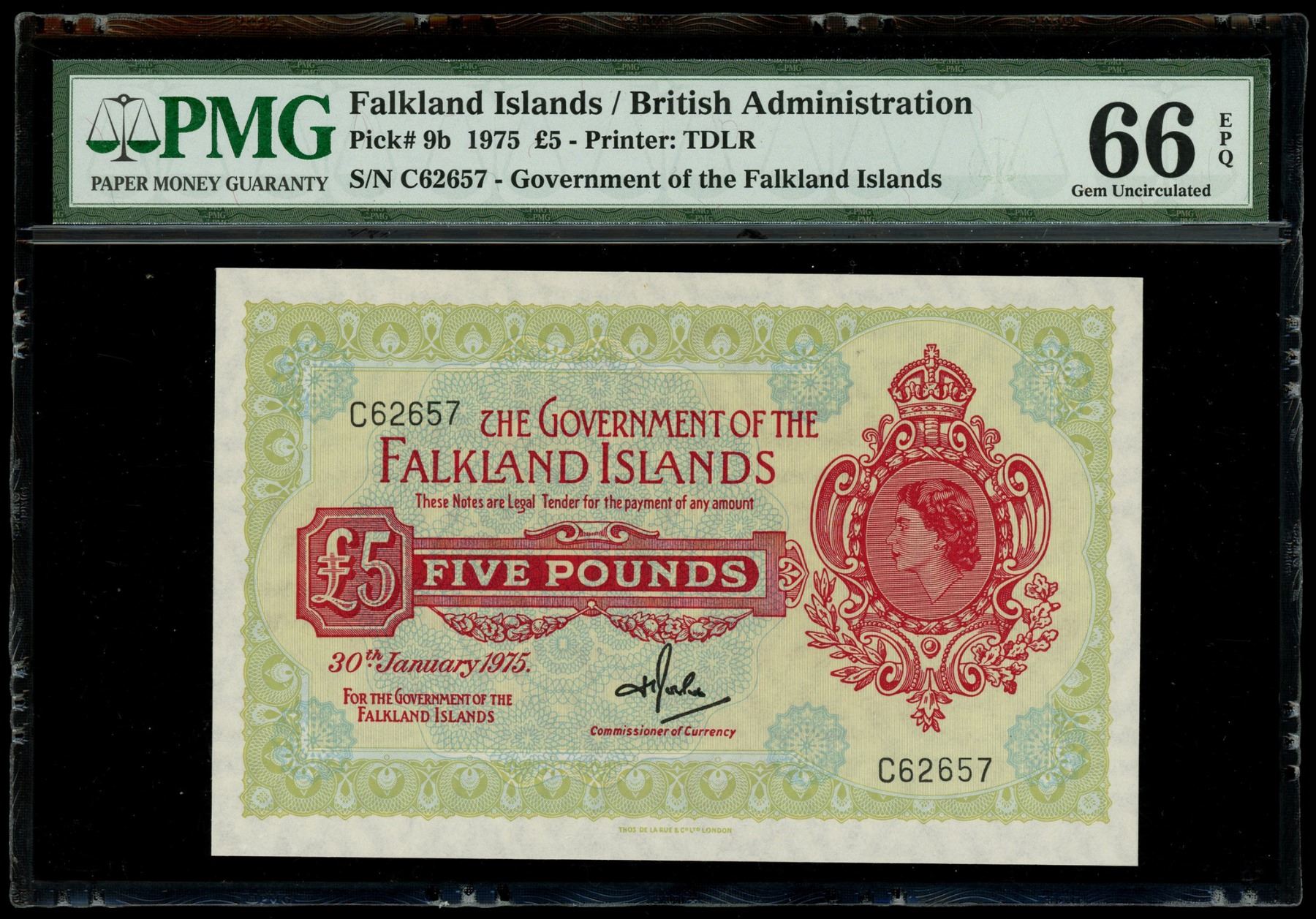 Falkland Islands, 5 pounds, 30-1-1975, Elizabeth II, serial C62657, PMG Gem UNC 66 EPQ. SCWPM-9b. Vibrant, contrasting red/green ink colors, good embossing, and great original paper quality.