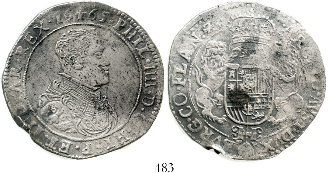 Flanders, Spanish Netherlands, portrait ducatoon, Philip IV, 1665. KM-50. 31.6 grams. Very sharp full legends and well-detailed portrait, light toning all over with dark spot of encrustation in shield, minimal corrosion, bump in edge. With certificate from the salvager (Stenuit). From the Slot ter Hooge, sunk in 1724 off Porto Santo, Madeira Islands
