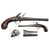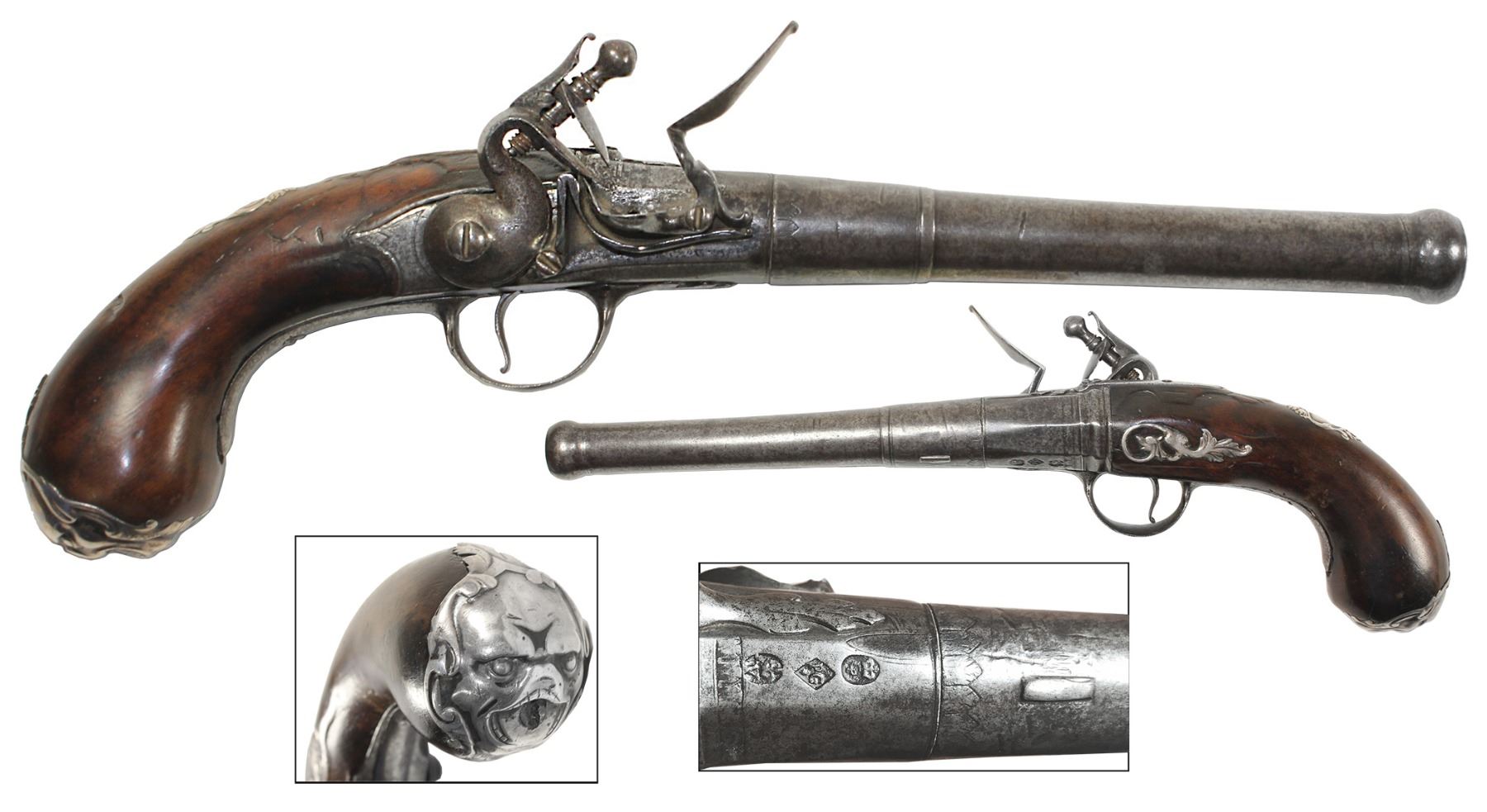 Flintlock pistol, English, ca. 1720 (Queen Anne period), with silver inlays and buttplate, marked and signed by maker Pierre Gandon (senior). 704 grams, 13" long, 8" barrel length. A very cute and well-marked little pistol, fully intact and operable, with cannon-type barrel that shows GANDON LONDON stamped under the lock on the breech, three touchmarks on the other side of the trigger (two with crowns in ovals and the third--in the middle--with PG inside a diamond shape), beautifully aged walnut grip with silver ornamental inlays and dogface butt cap, attractive overall.