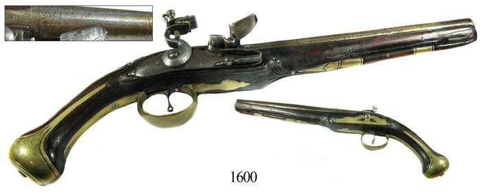 Flintlock pistol, probably Greek, 1790s-early 1800s. 1 lb 8.6 oz, 16" long. A fully functional pistol with steel barrel and flintlock, brass trigger-guard and buttplate, not terribly ornate but the wooden stock nicely carved, the barrel engraved on top with what appears to be Cyrillic lettering.