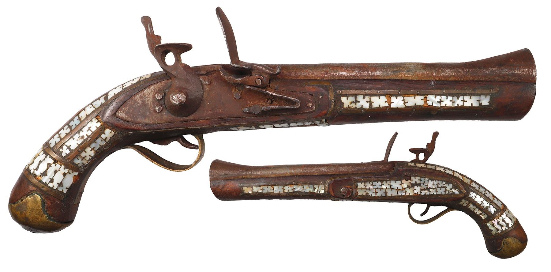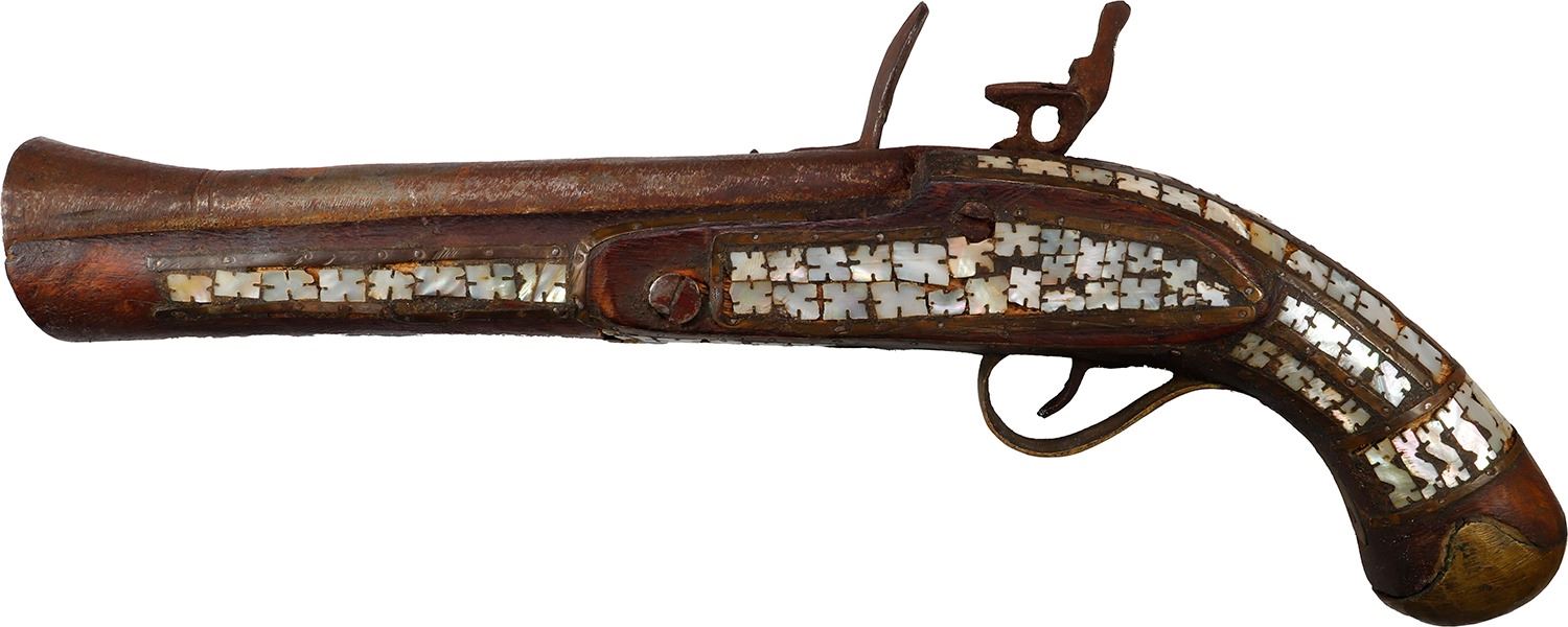 Flintlock pistol with blunderbuss barrel and mother-of-pearl inlays, 1700s. 785 grams. 15" long, 8" barrel, 1¾" bell. Ornate hand-held weapon of dark walnut stock with a brass butt plate and trigger guard, age-toned steel barrel, lock and hammer, many small mother-of-pearl geometric inlays.