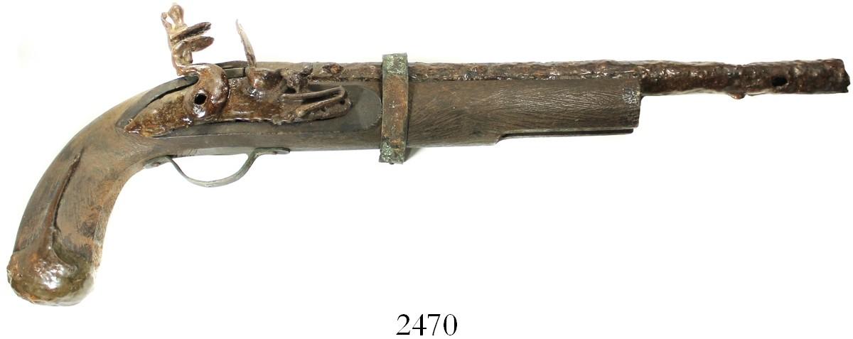 Flintlock pistol with reproduction wooden parts. 919 grams, 21" long. The trouble with shipwreck flintlocks is that they contain two materials that do not survive well: iron and wood. On this particular piece the iron lock, barrel, buttplate and brass trigger guard barely survived, but the wood stock did not, so Marty replaced it with an accurate facsimile and trigger guard and attached the iron pieces (conserved and thickly sealed, the lock and original trigger guard now separate) to make a museum display. From the Spanish 1733 Fleet, Florida Keys, pedigreed to the Marty Meylach collection.
