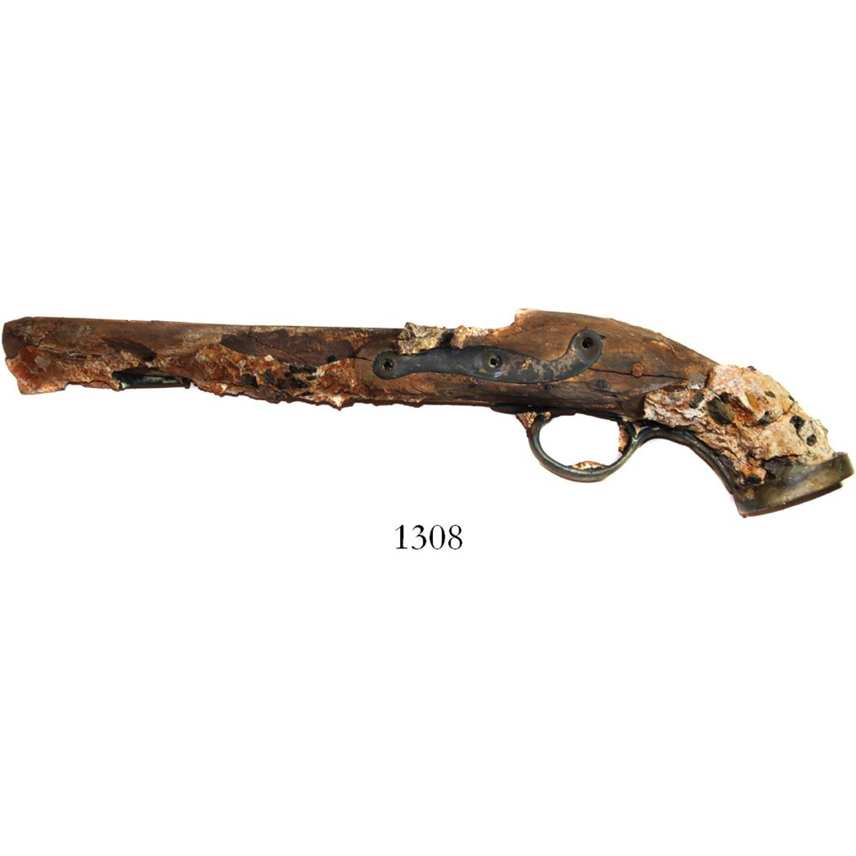 Flintlock pistol, with wood and furniture intact but missing the actual lock. 555 grams, 16" long. Amazingly, the entire wooden stock of this typical pistol escaped the usual rot and worm-damage that obliterates wood, but the iron parts are all rusted away, leaving voids in the wood, onto which the brass parts (trigger guard, buttplate, sideplate and ramrod holder) were left attached or were re-attached with encrustation. Pedigreed to the Marty Meylach collection. Recovered from:Spanish 1733 Fleet, Florida Keys