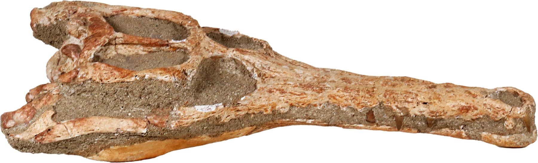 Fossilized crocodile skull, Cretaceous period, approx. 145 to 66 million years old, species Dyrosaurus, found in Morocco. 2511 grams total. 71" x 7½" x 3½". From the Khouribga phosphate mines, this fossil of an ancient crocodile relative that grew up to 19 feet long is partially restored but remarkably intact with skull and snout held together in a cement-like matrix, several brownish teeth visible, clearly recognizable for what it is.