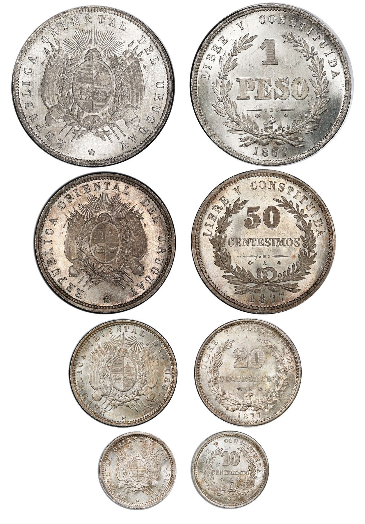 Four-coin denomination set of Uruguay (struck at the Paris mint) coins of 1877-A in PCGS slabs: 1 peso, MS65; 50 centesimos, MS65; 20 centesimos, MS66; 10 centesimos (anchor left), MS65. ,KM-17, 16, 15 and 14. Nicely matched set of high-grade examples (all either top grade or close to it), all with choice luster and no marks or wear. PCGS #38494472, 38494473, 38494474, 38494475.