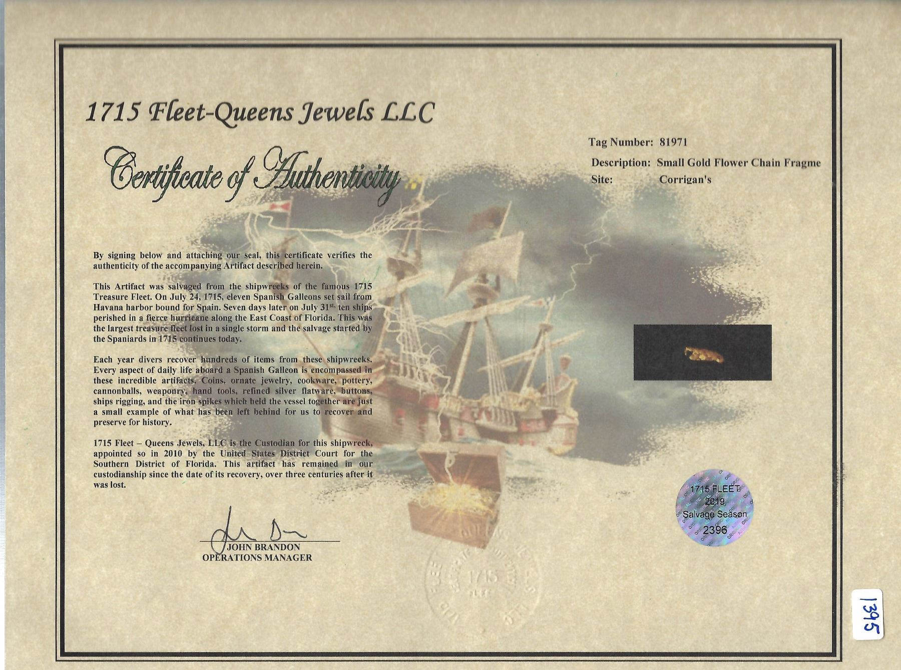 Fragment of gold "olive blossom" chain, ex-1715 Fleet. 0.41 gram, 3/8" long. Very small but recognizable few links of "olive blossom" chain, a typical design made of two-sided links of six-petal flowers in fairly tight formation, a quantity of which was found on the 1715 Fleet, pointing to its use as a "money chain" (tax-free gold), bits of sedimentation in crevices. From the 1715 Fleet (Corrigans site), with plastic tag and photo-certificate #81971 from Queens Jewels.