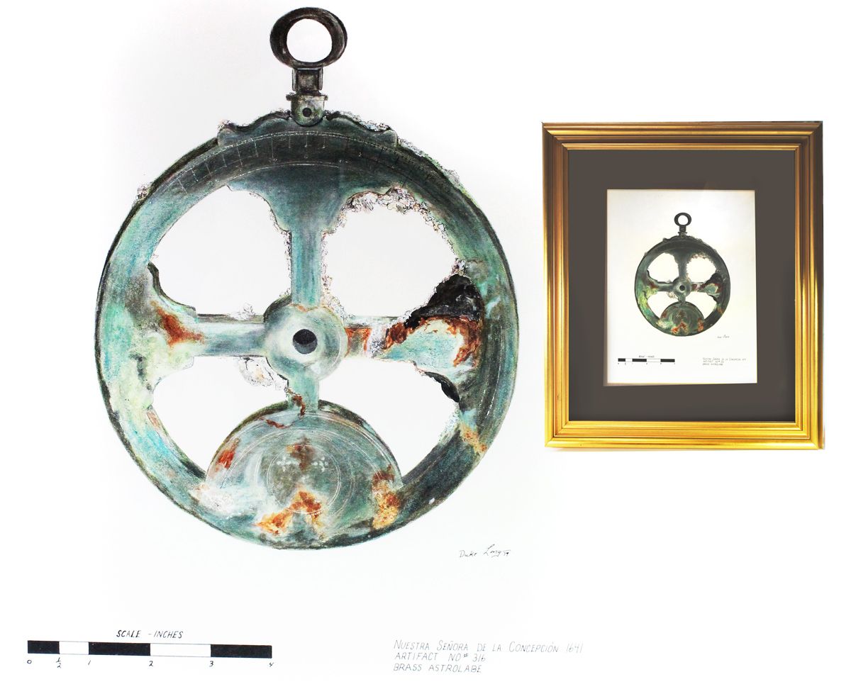 Framed, matted, full-color drawing of the Concepcion (1641) astrolabe by Duke Long (ca. 1980). 23" x 20" in frame, the actual image about 13-1/2" x 10". While Duke Long lithographs can be found from time to time, this piece is very rare as an original, the colors and detail so accurate that it looks like a photograph, in perfect condition and ready for hanging on your wall.