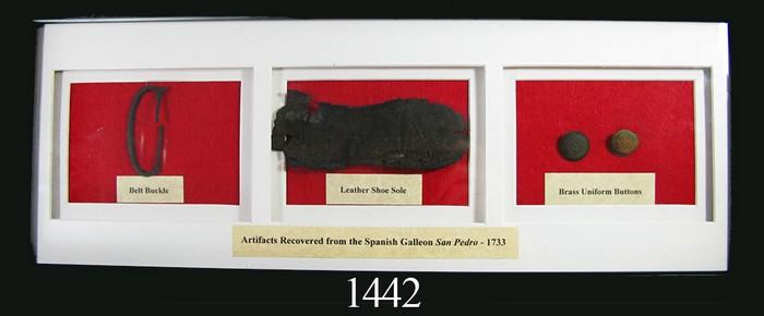 Framed set of artifacts (buckle, shoe sole and buttons). 940 grams, 20" x 8" x 1". A rectangular "shadow-box" frame with glass, the artifacts fastened to red felt behind white mats with paper labels that identify the items and give the name of the ship. Recovered from: Spanish 1733 Fleet, sunk in the Florida Keys. From the San Pedro site.