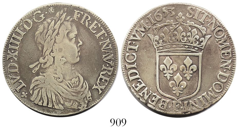 France (Angers mint), ecu, Louis XIV, 1653-F. KM-155.5 27.78 grams. Toned VF, parts of rims crude (as made), scarce.