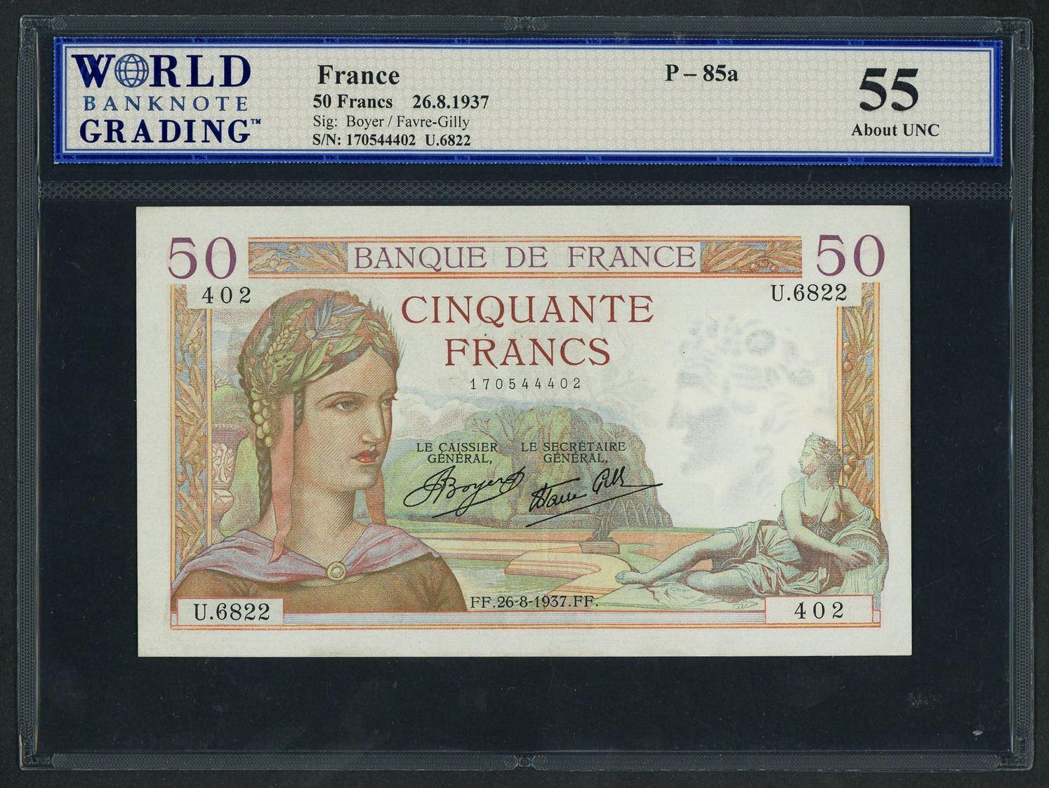 France, Banque de France, 50 francs, 26-8-1937, series U. 6822, serial 170544402, WBG AU 55. SCWPM-85a. Teller handling around edges but no major folds, vibrant allegorical design. WBG #0132956.