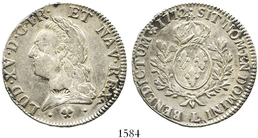 France (Bayonne mint), ecu, Louis XV, 1772-L, with unidentified sunburst countermark on neck.