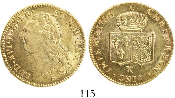 France (Bordeaux mint), double louis d' or, Louis XVI, 1786-K. KM-592.1 . 15.28 grams. Lustrous UNC with faint hairlines, tiny (old) clip in edge.