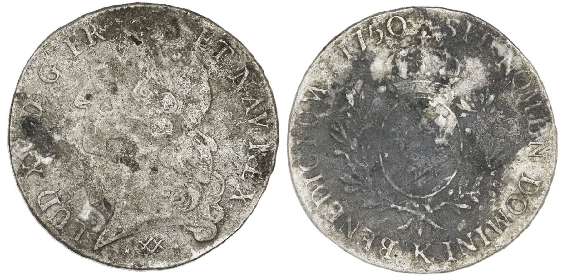 France (Bordeaux mint), ecu, Louis XV (large bust), 1750-K. KM-512.11 . 27.2 grams. VF details but some surface oxidation (mostly dark on reverse). Recovered from: Auguste, sunk in 1761 off Nova Scotia, Canada