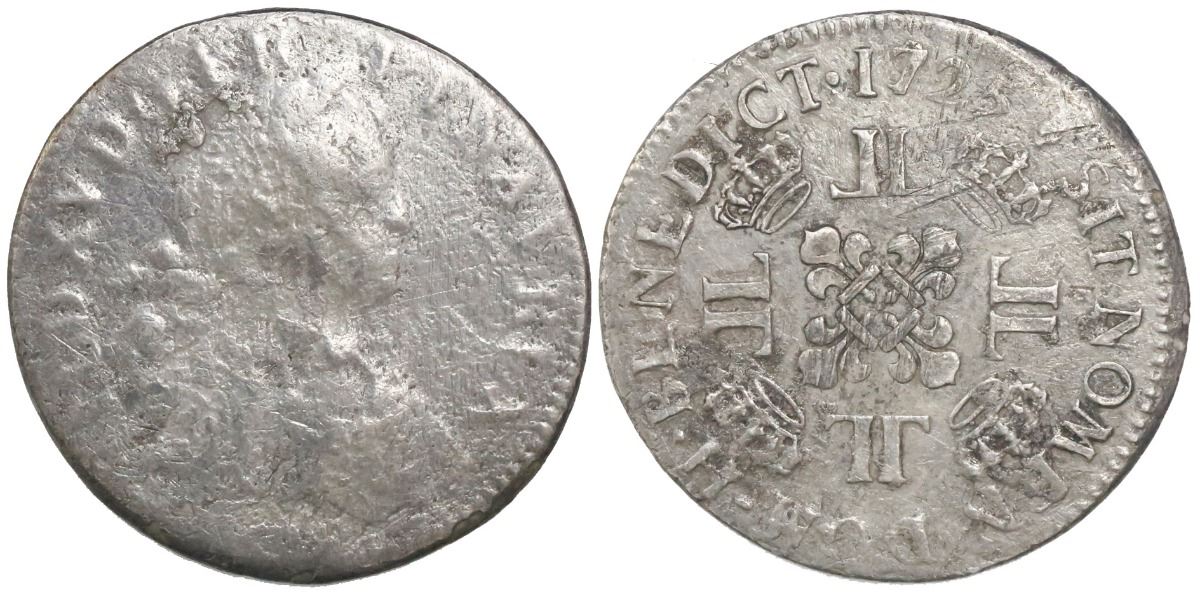 France (La Rochelle mint), ecu, Louis XV, 1725-H. Dupl-1670; KM-472.9. 19.35 grams Typically well-detailed reverse (with toning around details) but heavily corroded obverse (silvery). Recovered from: Le Chameau, sunk in 1725 off Nova Scotia, Canada
