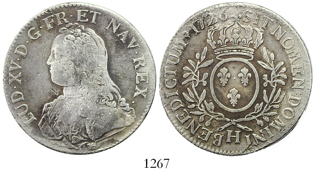 France (La Rochelle mint), ecu, Louis XV, 1726-H. KM-486.9 28.26 grams. Solid and nicely toned, Fine details but minimal corrosion (just on parts of rims). Pedigreed to the Auguste Research Collection, with original certificate from the salvagers. Recovered from: Auguste, sunk in 1761 off Nova Scotia, Canada