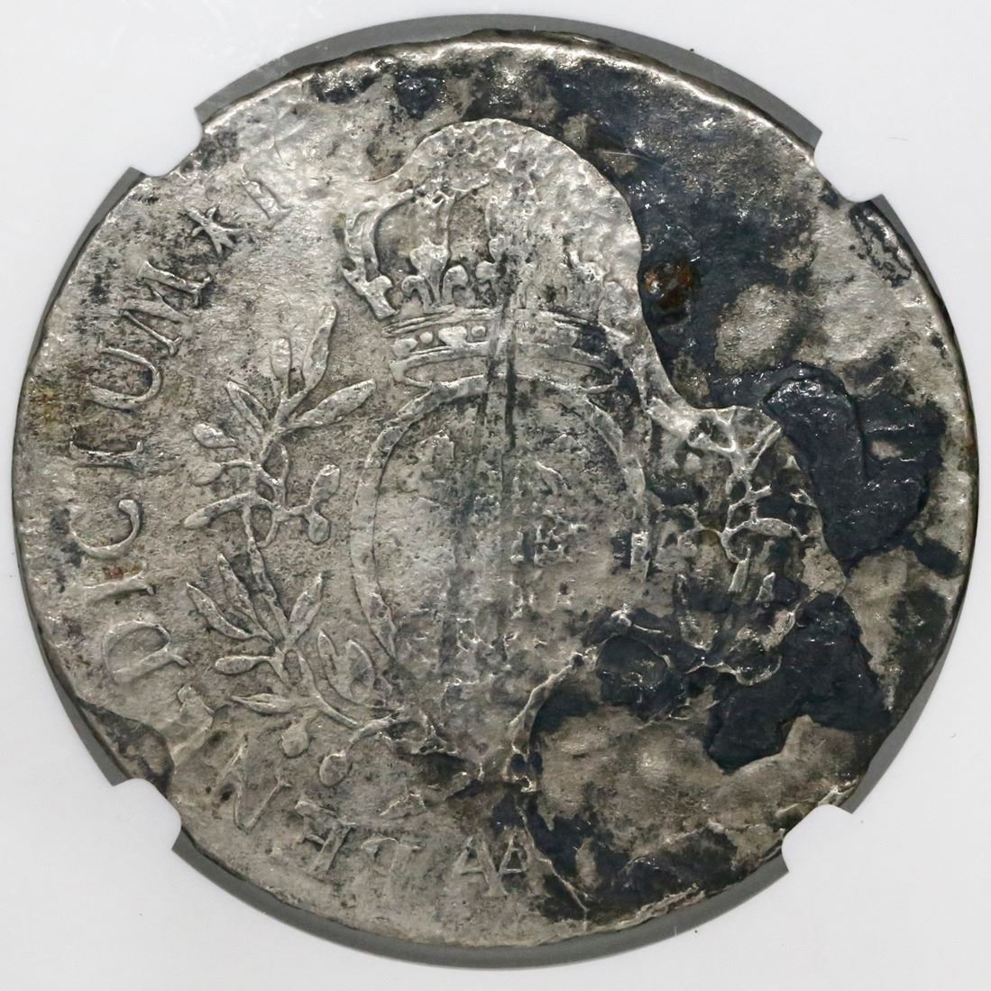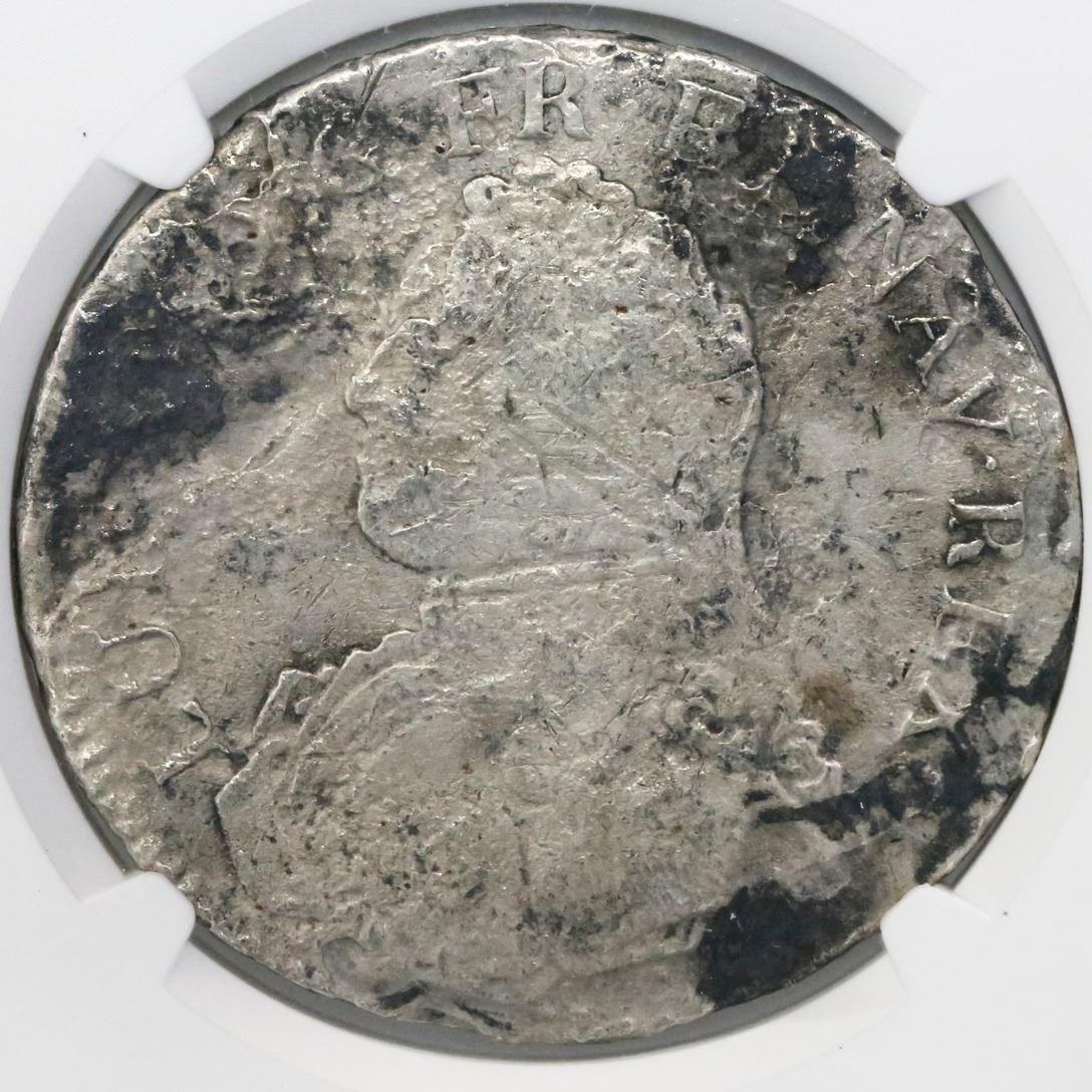 France (Metz mint), ecu, Louis XV, (1726-39)-AA, small bust, NGC genuine / La Dramadaire [sic]. KM-486.2. Less corroded than most but with lots of black patches, fairly clear details (including heavy adjustment marks on reverse). NGC #2068303-439. La Dromadaire, sunk in 1762 off the Cape Verde Islands, west of Africa