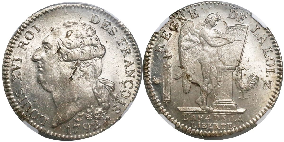 France (Montpelier mint), ecu, Louis XVI, 1792-N, encapsulated NGC MS 62, finest and only specimen in NGC census. Ciani-2238; Dav-1335; Duplessy-1718; Gad-55; KM-615.11. An attractive and historical example of a "constitutional ecu" named for the allegorical figure Genius writing the constitution on the reverse and struck in 1792 and 1793. This 1792 example is the scarcer date for Montpelier and was struck just months before Louis XVI was guillotined. Appealing for the grade with bright white luster, some adjustment marks and lamination flaws (typical for the date). NGC certification number 4348118003.