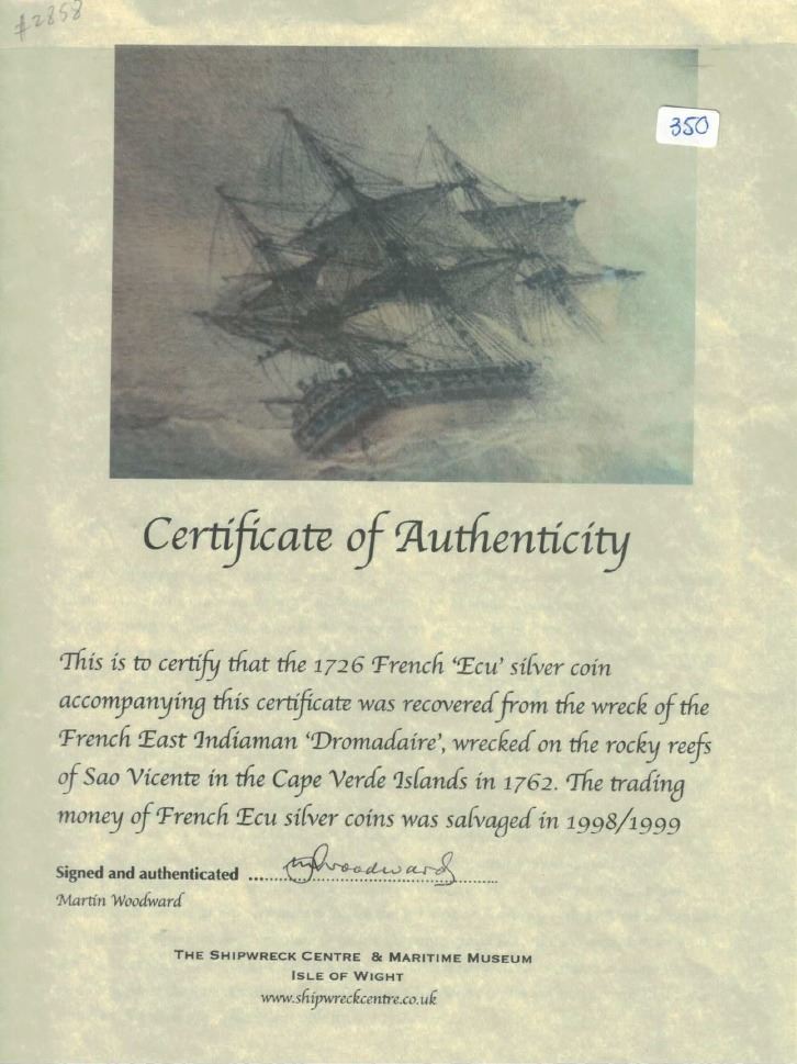 France (Nantes mint), ecu, Louis XV, 1736-T, ex-Jones. KM-486.20. 27.15 grams. Choice specimen with full XF/AU details against evenly toned fields, light surface corrosion and heavy adjustment marks (typical), very solid overall. Pedigreed to the Dr. Peter Jones collection and to our Auction 24, with original lot-tag #615 and certificate from the salvor. Recovered from: Le Dromadaire, sunk in 1762 off Cape Verde Islands, west of Africa