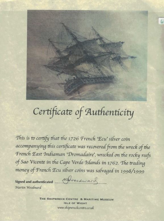 France (Nantes mint), ecu, Louis XV, 1736-T. KM-486.20. 27.16 grams. Choice XF/AU details with lovely toning on fields (the reverse particularly nice), adjustment marks at bottom of obverse / top of reverse. With certificate from the salvager. Recovered from: Le Dromadaire, sunk in 1762 off Cape Verde Islands, west of Africa