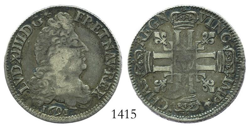 France (Paris mint), 1/2 ecu, Louis XIV, 1691-A. KM-273.1. 13.3 grams. Richly old-toned VF with weak centers, popular issue.