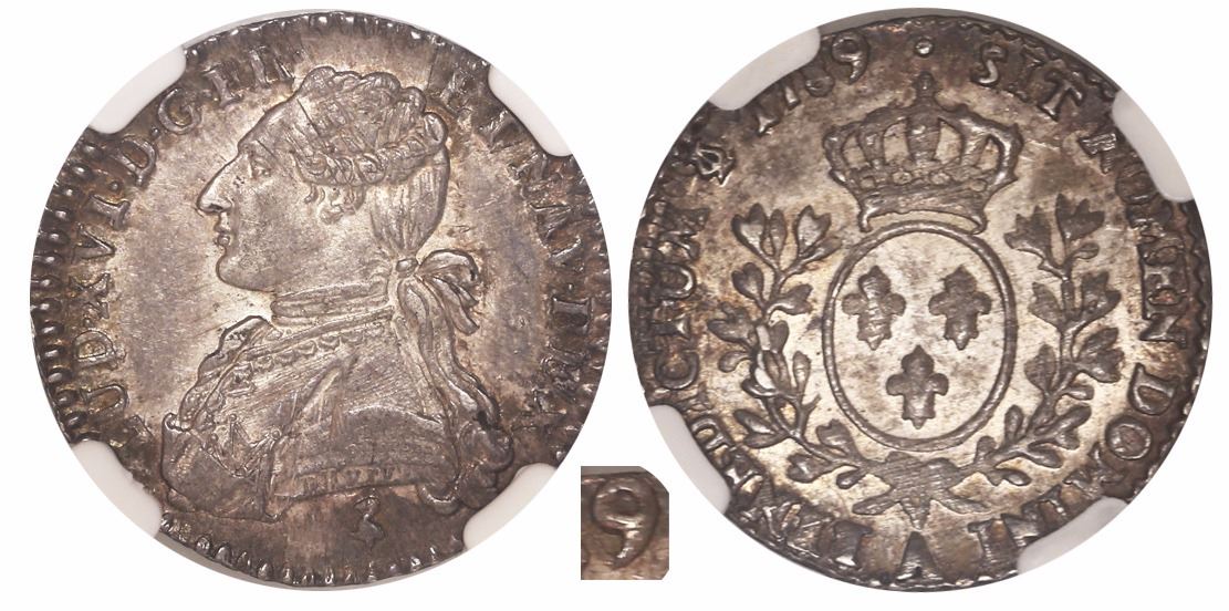 France (Paris mint), 12 sols, Louis XI, 1789/6-A, encapsulated NGC MS 62, tied for finest known in NGC census, unlisted overdate. Bold strike with nice toning and luster around details (tied with one other MS 62 at NGC), light adjustment marks on both sides, clear overdate that is not mentioned inside the slab but is very interesting and important because 1787 and 1788 are "reported, not confirmed" (according to KM) and 1789/6 would seem to condemn the existence of the dates in between.