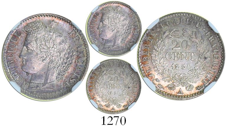 France (Paris mint), 20 centimes, 1850-A, encapsulated NGC MS-63. Gadoury-303; KM-758.1. Lightly rainbow toned with underlying luster, minor die-breaks.