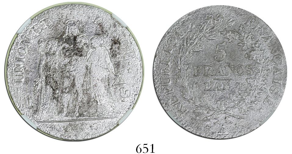 France (Paris mint), 5 francs, l'an 7 (1798-9), mintmark A, encapsulated NGC shipwreck effect. KM-639.1. Silvery from cleaning and with light surface corrosion all over, small patches of toning, very scarce as from this wreck and desirable as struck during the French revolution of 1789-99. With shipwreck provenance stated inside the slab. Recovered from: S.S. New York, sunk in 1846 off Louisiana