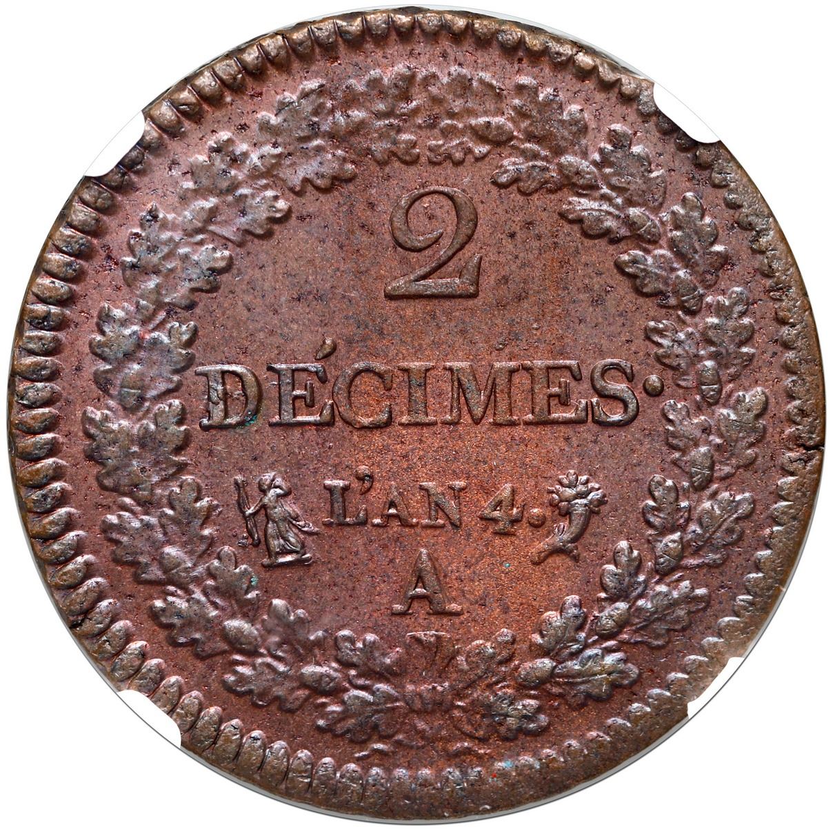 France (Paris mint), bronze 2 decimes, l'an 4 (1795-6), mintmark A, NGC MS 63 Brown.