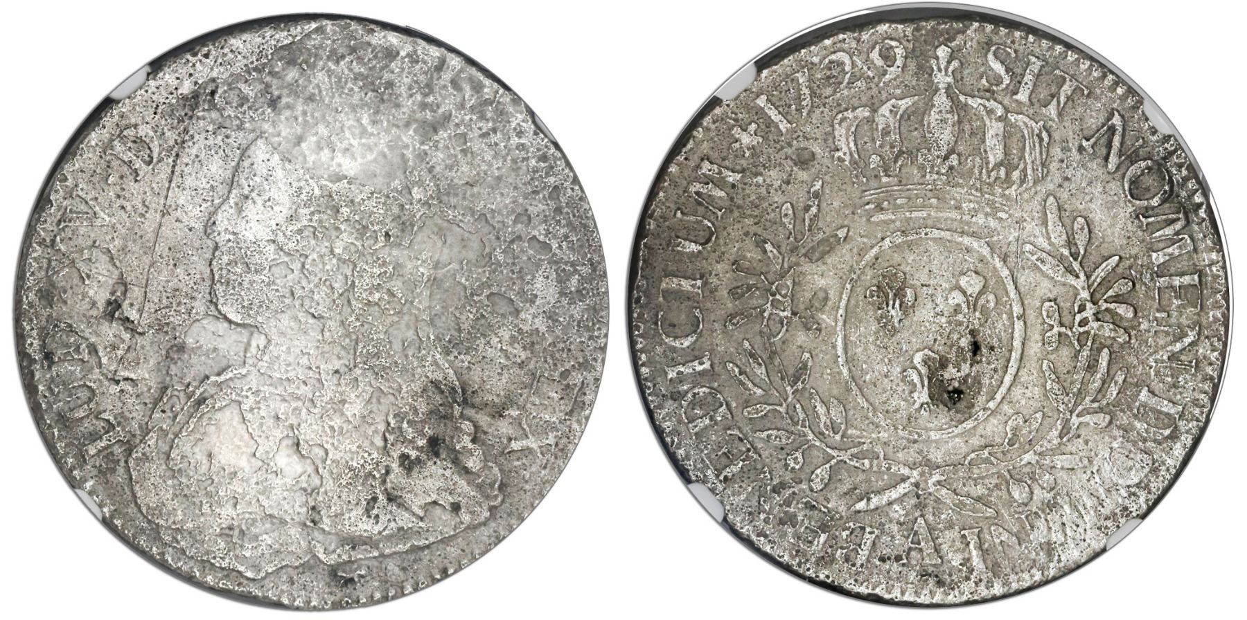 France (Paris mint), ecu, Louis XV, 1729-A, NGC genuine / La Dramadaire. Dav-1330. Moderate surface corrosion, full reverse details. NGC #2068303-164. Recovered from: Le Dromadaire, sunk in 1762 off the Cape Verde Islands, west of Africa