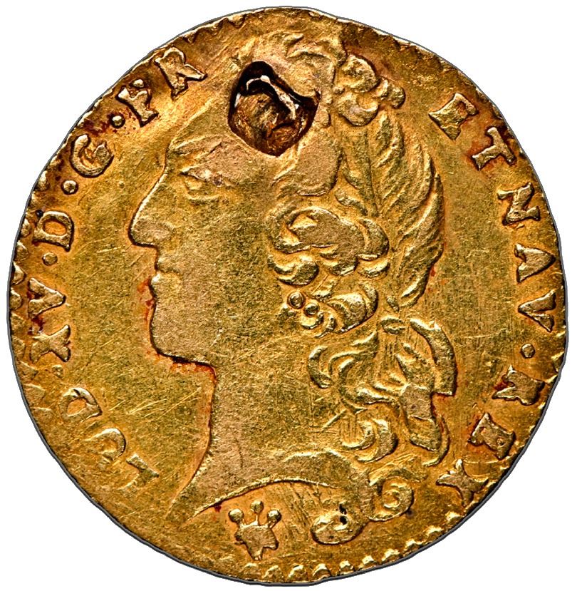 France (Paris mint), gold 1/2 louis d'or au bandeau, Louis XV, 1768-A, rare, NGC XF details / plugged, finest and only example in NGC census. KM-517.1; Gad-330 (R3); Dup-1644; L4L-493 (R4); Fr-465. Very scarce date, the details all bold but slightly crude in execution and preservation, with a plug so irregular that we suspect it might have been related to weight-regulation and not just suspension as a pendant. Please use this link to verify the certification number