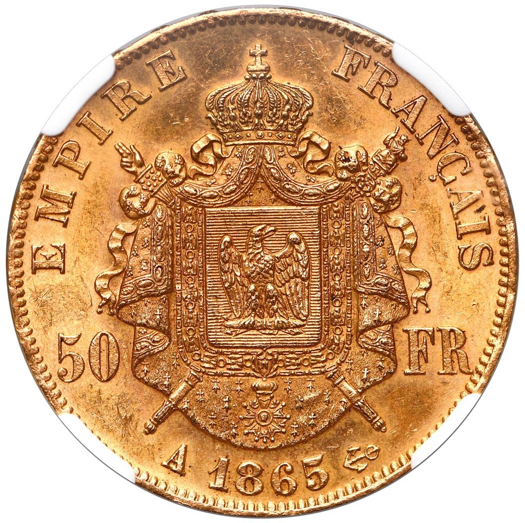 France (Paris mint), gold 50 francs, Napoleon III, 1865-A, NGC MS 62. Gad-1112; KM-804.1. Rich gold color and cartwheel luster, minor bagmarks only.