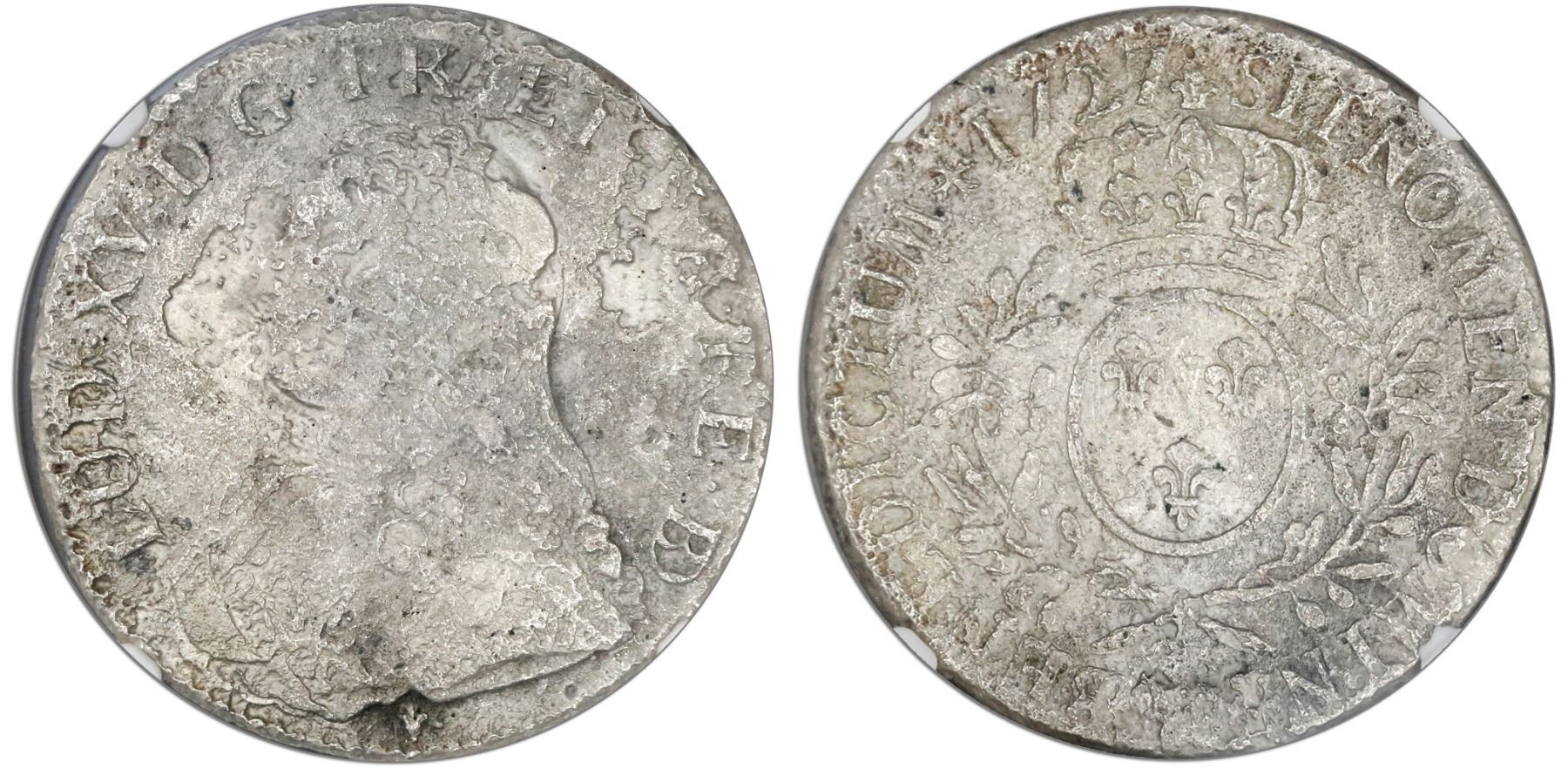 France (Pau mint), ecu, Louis XV, 1727, mintmark cow, NGC genuine / La Dramadaire. Dav-1330. Full details despite light to moderate surface corrosion. NGC #2068303-243. Recovered from: Le Dromadaire, sunk in 1762 off the Cape Verde Islands, west of Africa