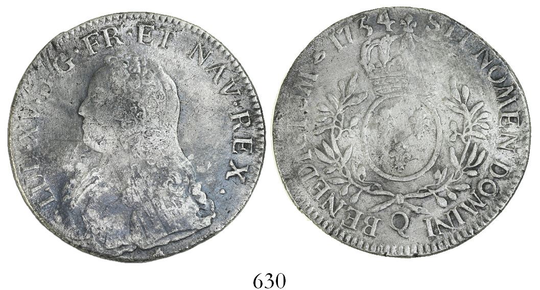 France (Perpignan mint), ecu, Louis XV, 1734-Q, ex-Lane. KM-486.17. 27.84 grams. Minimal corrosion, full details, uneven toning. Pedigreed to the Lane (Penzance) auction of June 1983, with original lot-tag #758. Recovered from: Auguste, sunk in 1761 off Nova Scotia, Canada