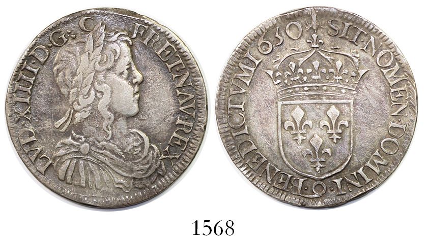 France (Rennes mint), 1/2 ecu, Louis XIV, 1650-"9". KM-164.24 13.56 grams. Richly toned VF+, slightly crude rims (as made).