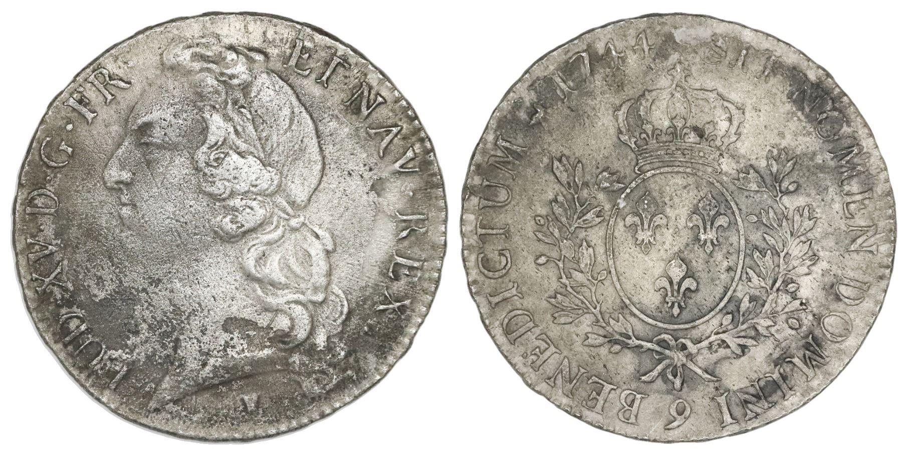 France (Rennes mint), ecu, Louis XV (large bust), 1744, mintmark 9.