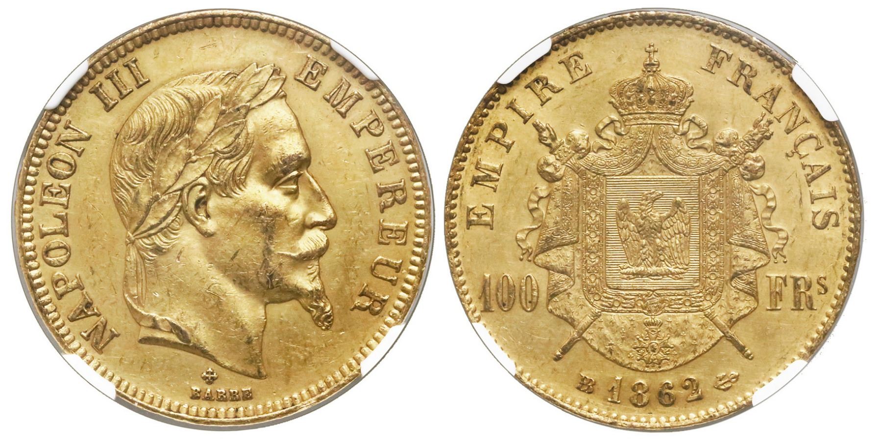France (Strasbourg mint), 100 francs, 1862-BB, Napoleon III, NGC MS 61.