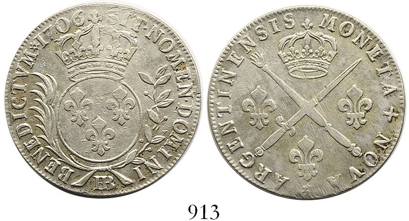 France (Strasbourg mint), 33 sols, Louis XIV, 1706-BB. KM-371 9.09 grams. Choice XF+ with original mint luster and very light toning, minor stress cracks in center of obverse.
