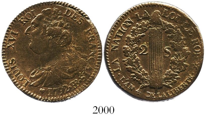 France (Strasbourg mint), copper 2 sols, Louis XVI, 1792-BB, l'an 4.