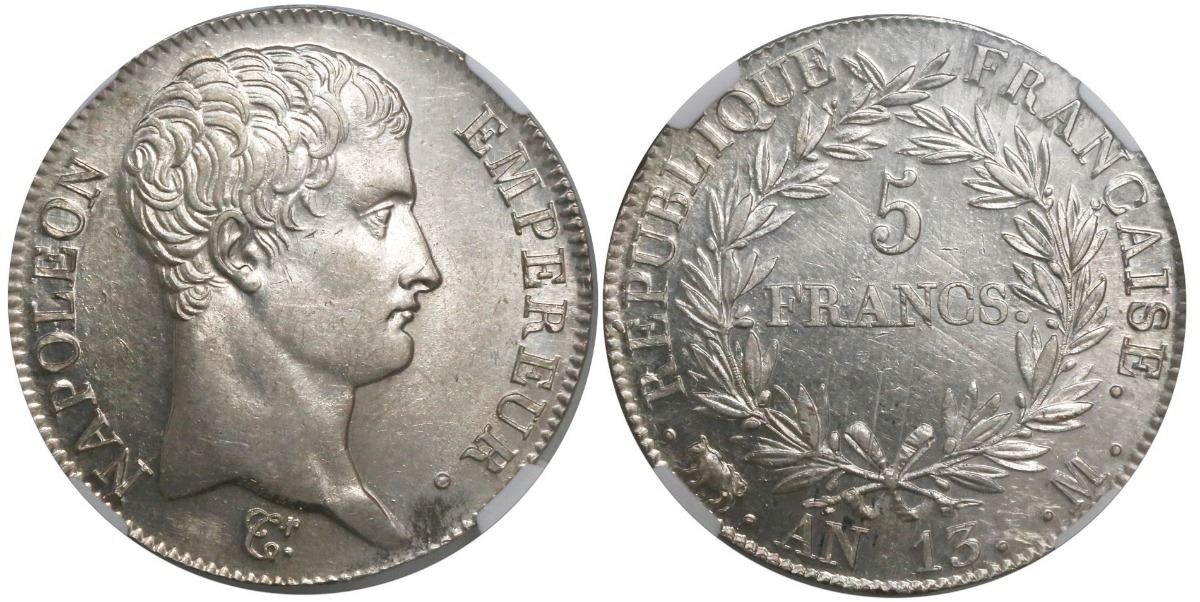 France (Toulouse mint), 5 francs, Napoleon I, An-13 (1804), encapsulated NGC AU 58, tied for finest