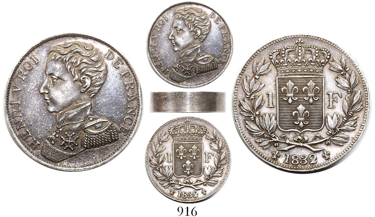 France, double piedfort (triple thickness) 1 franc, Henry V Pretender, 1832. KM-X28.1a 26.70 grams AU/UNC with nice toning, slightly granular obverse surface (rusty die), minor rim-bruise, interesting special issue.