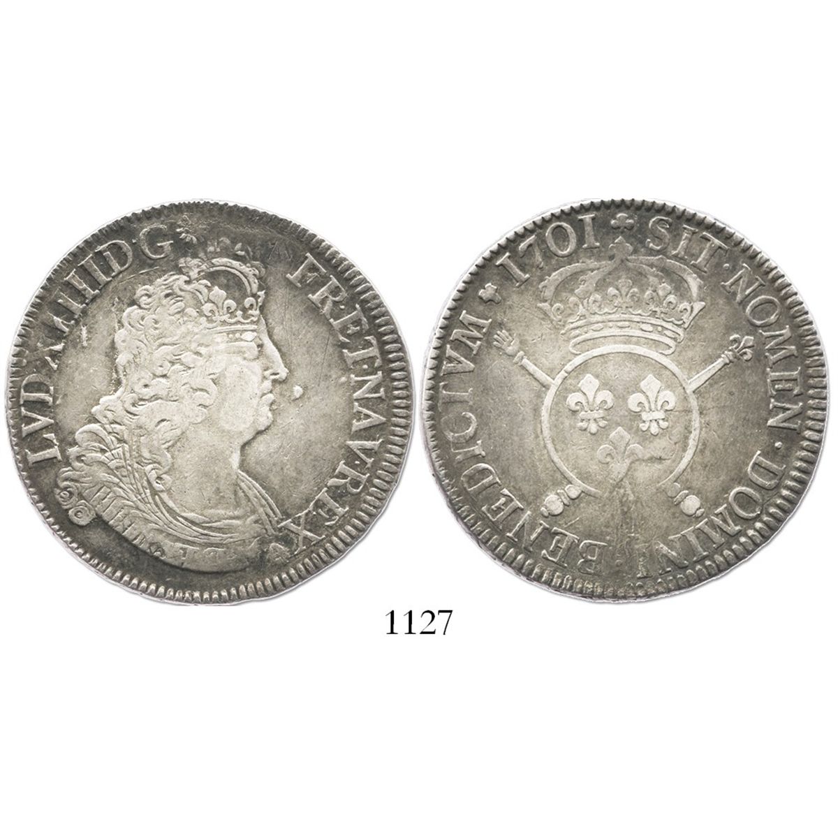 France (mint uncertain), ecu, Louis XIV, 1701, struck over an earlier ecu.